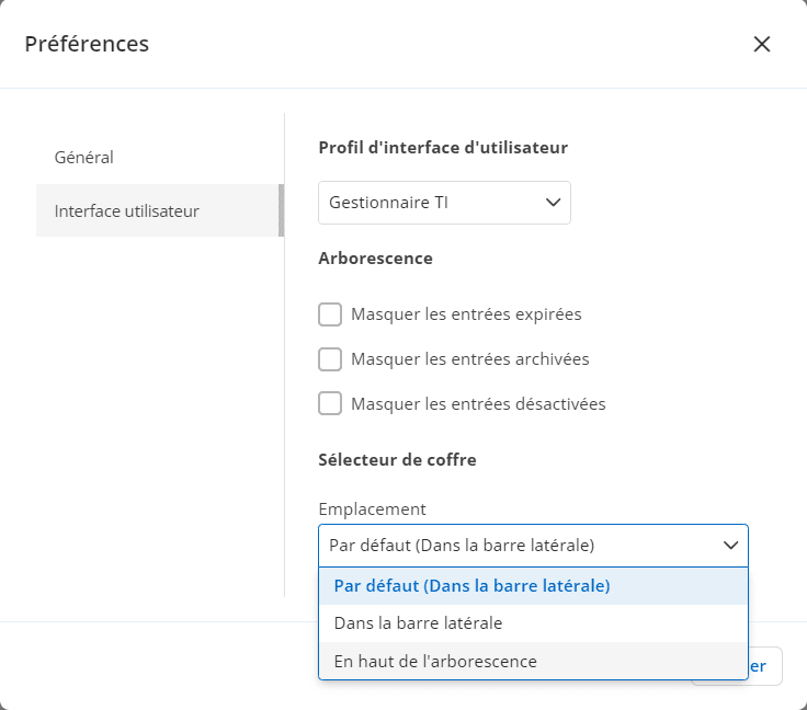 Ne vous inquiétez pas : le sélecteur de coffres peut être remis à sa position initiale (au haut de l’arborescence) dans les préférences de l’interface utilisateur.