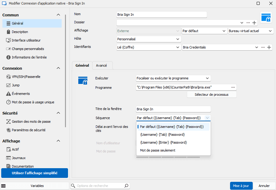 En alternative au bouton Ouvrir la session, avec l’application Bria en avant-plan, appuyer sur Ctrl+Space sur votre clavier fera apparaître la recherche rapide universelle de RDM. La fenêtre Bria est alors automatiquement détectée et les identifiants sont remplis. Gagnez du temps en automatisant vos connexions aux applications natives via RDM!