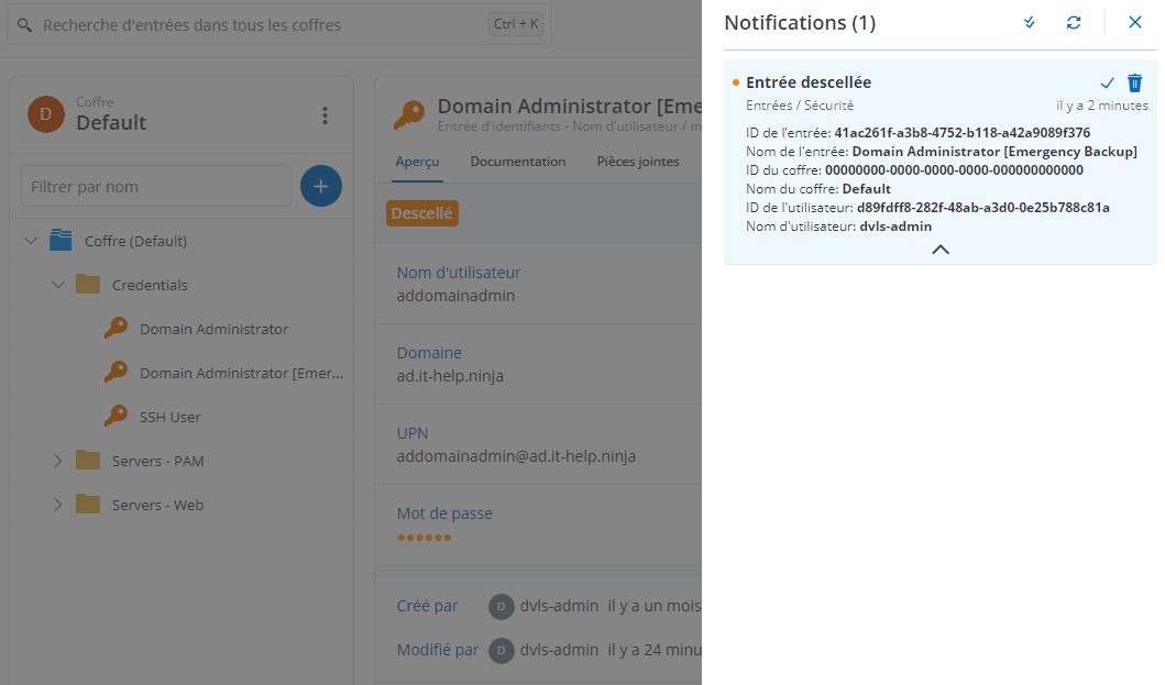 Une entrée scellée nécessite qu’un utilisateur avec les permissions appropriées descelle activement l’entrée pour y accéder, ce qui déclenchera l’envoi d’une notification à tous les administrateurs de DVLS. Bien que des rôles correctement définis déterminent qui peut accéder à l’entrée en premier lieu, le sceau de l’entrée ajoute une couche supplémentaire de protection en décourageant l’utilisation occasionnelle et en alertant les administrateurs de toute tentative d’accès.