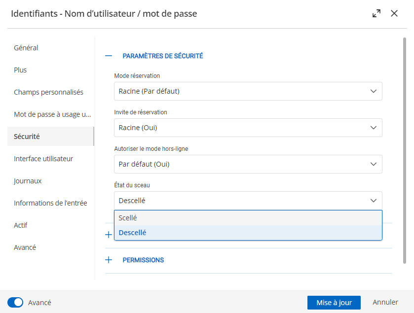 Sceller une entrée d’identifiants est aussi simple que d’activer le paramètre. Que vous commenciez depuis l’interface web de Devolutions Server ou le client Remote Desktop Manager, naviguez jusqu’à l’onglet Sécurité d’une entrée d’identifiants. Une fois là, localisez la section Paramètres de sécurité et changez l’état du sceau en Scellé.