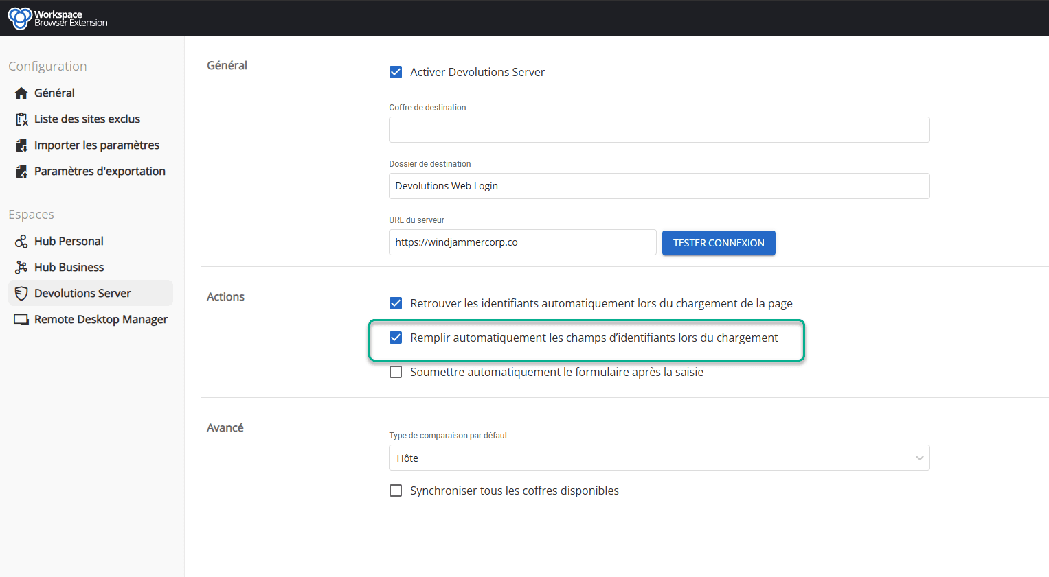 L’extension de navigateur Workspace comprend des paramètres pour améliorer votre expérience web. Activez la fonctionnalité Remplir automatiquement les champs d’identifiants lors du chargement dans les Paramètres de l’extension de navigateur et sélectionnez l’espace applicable où vous souhaitez apporter des modifications. Vous trouverez ce paramètre sous Actions.