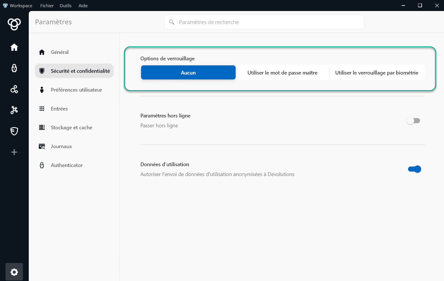 Remarque : Il existe un paramètre de gestion des utilisateurs dans Devolutions Hub et Devolutions Server qui affecte l’utilisation du mode hors ligne.