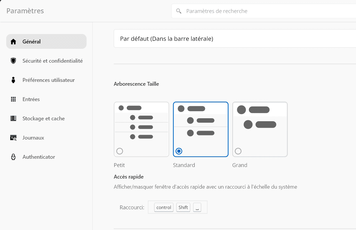 Préférez-vous que la vue en arborescence de vos coffres soit plus petite pour voir plus d’entrées ou plus grande pour une meilleure visibilité ? Les deux options sont possibles. Dans les paramètres généraux, vous pouvez facilement ajuster la taille de la vue en arborescence selon vos préférences.