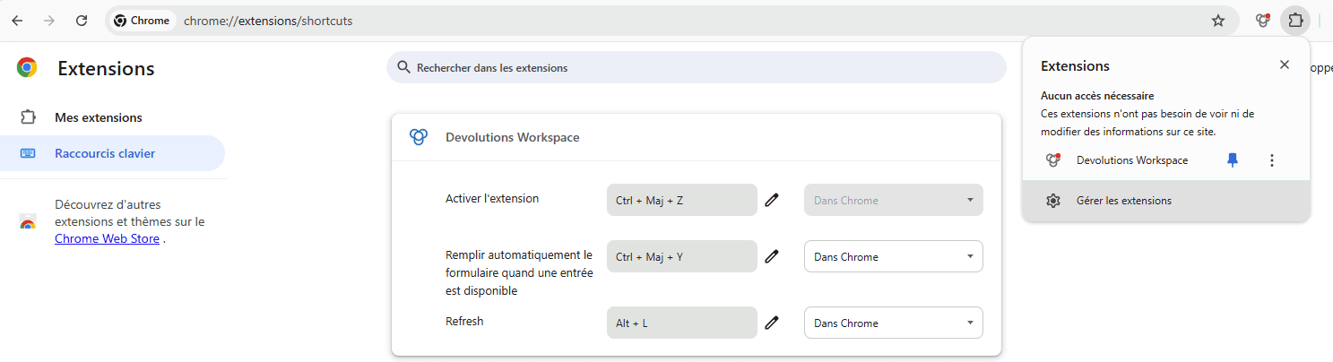 Comme d’autres extensions de navigateur, Devolutions Workspace dispose de ses propres touches de raccourci :