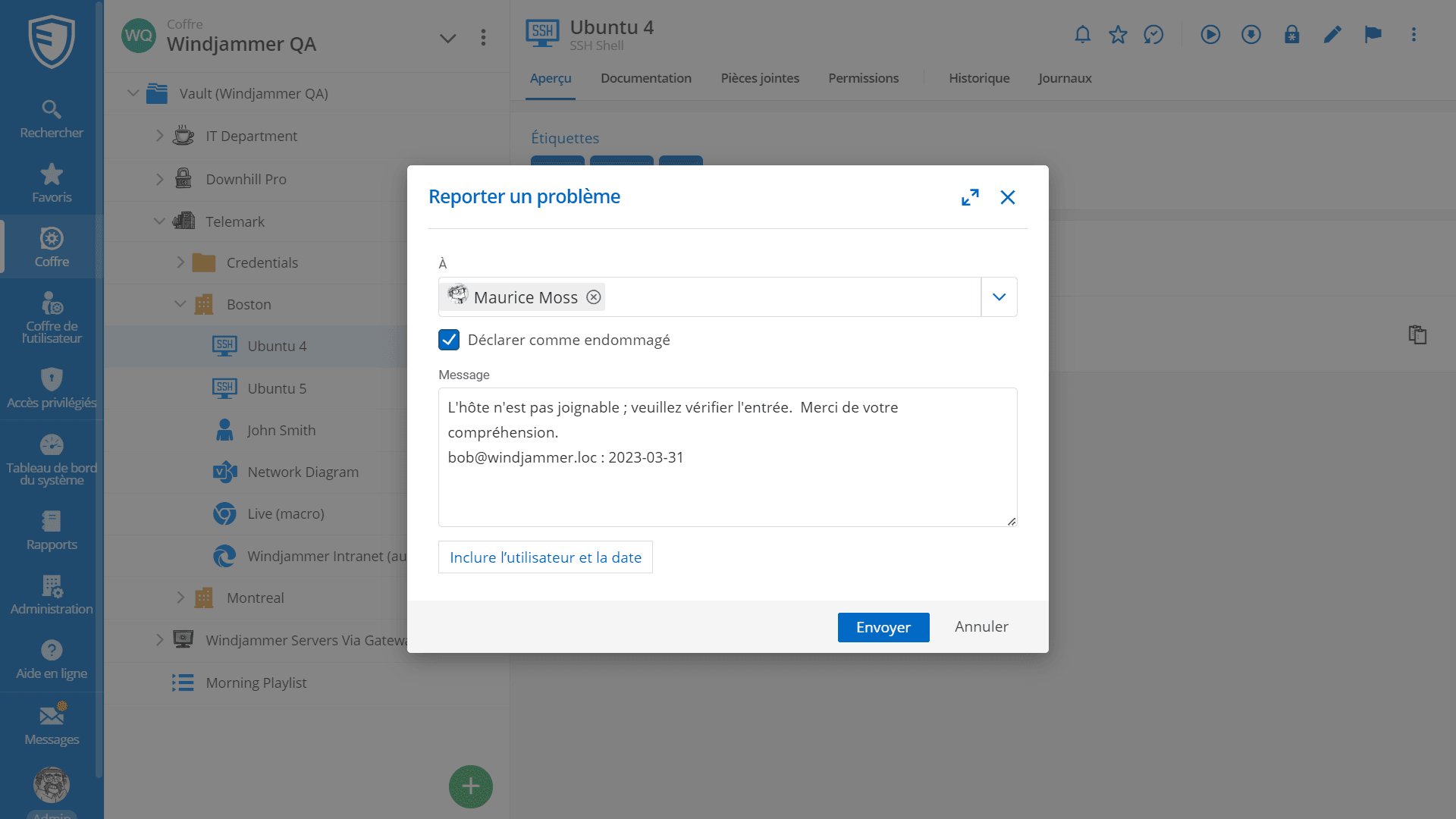 Une fois le rapport effectué, les administrateurs reçoivent une notification par courrier et voient l’entrée signalée dans un nouveau widget sur leur tableau de bord. Dès que le problème est résolu, le statut redevient « normal » et l’utilisateur continue sa tâche.