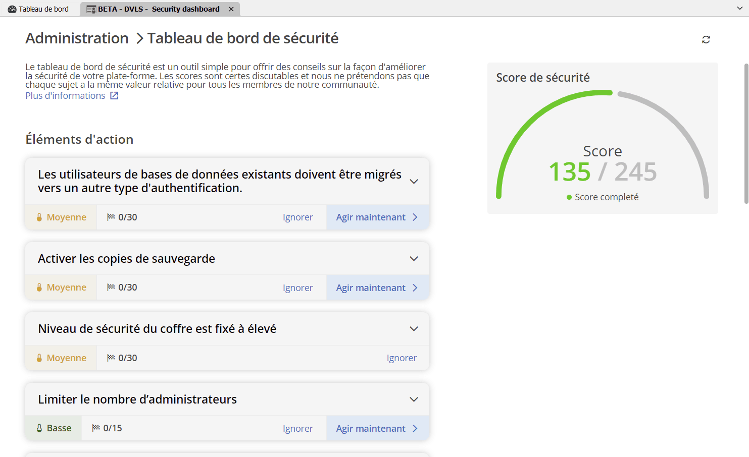 - Score de sécurité : Le tableau de bord attribue un score de sécurité à votre environnement RDM en fonction de divers facteurs, tels que les politiques de mot de passe, les permissions des utilisateurs et les configurations de contrôle d’accès. Ce score permet aux administrateurs d’évaluer rapidement leur posture de sécurité globale et de prioriser les domaines nécessitant une attention particulière.
