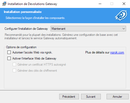 Le nouvel installateur de Gateway facilite la prise en main des nombreuses nouvelles fonctionnalités de Devolutions Server. Il permet, entre autres, de configurer l’interface Web autonome, ngrok, les certificats à utiliser et les ports écouteur.