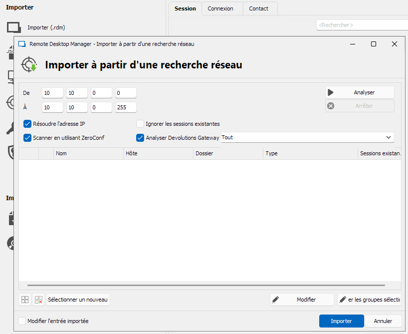 Lorsque combiné à Remote Desktop Manager, Gateway peut désormais servir de relais pour découvrir les ressources dans des réseaux segmentés. Il suffit e lancer Remote Desktop Manager, de naviguer jusqu’à la section Importer –> Importer à partir d’une recherche réseau, puis de sélectionner Analyser Devolutions Gateway ainsi que la passerelle à utiliser.