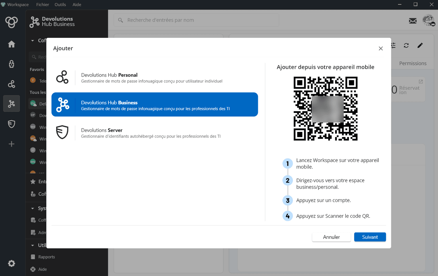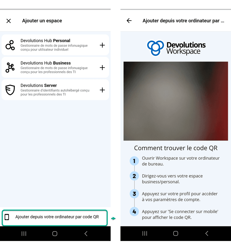 Sur l’application mobile : Cliquez sur « Ajouter un espace » puis « Ajouter depuis le bureau par code QR ». Suivez les étapes pour trouver le code QR depuis votre ordinateur de bureau.