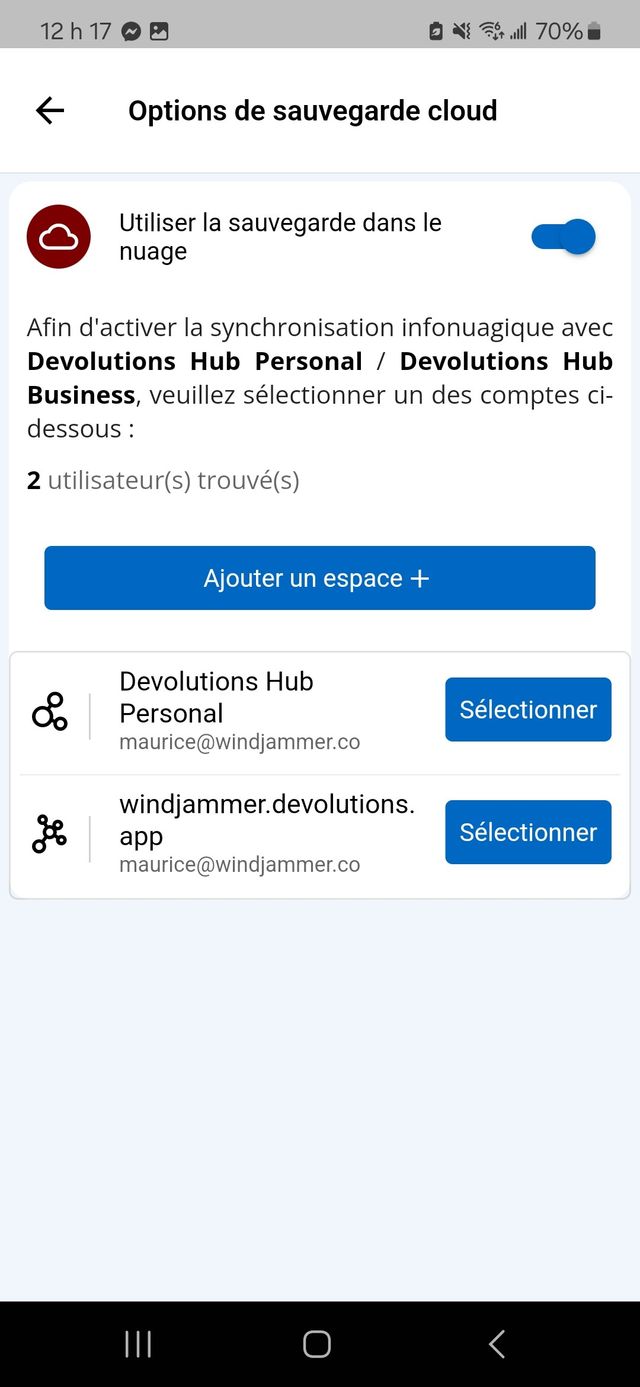 Pour sauvegarder vos codes d’entrée Authenticator, accédez aux paramètres d’Authenticator, sélectionnez « Options de sauvegarde cloud » et choisissez avec quel Devolutions Hub vous souhaitez synchroniser Authenticator pour les sauvegardes.