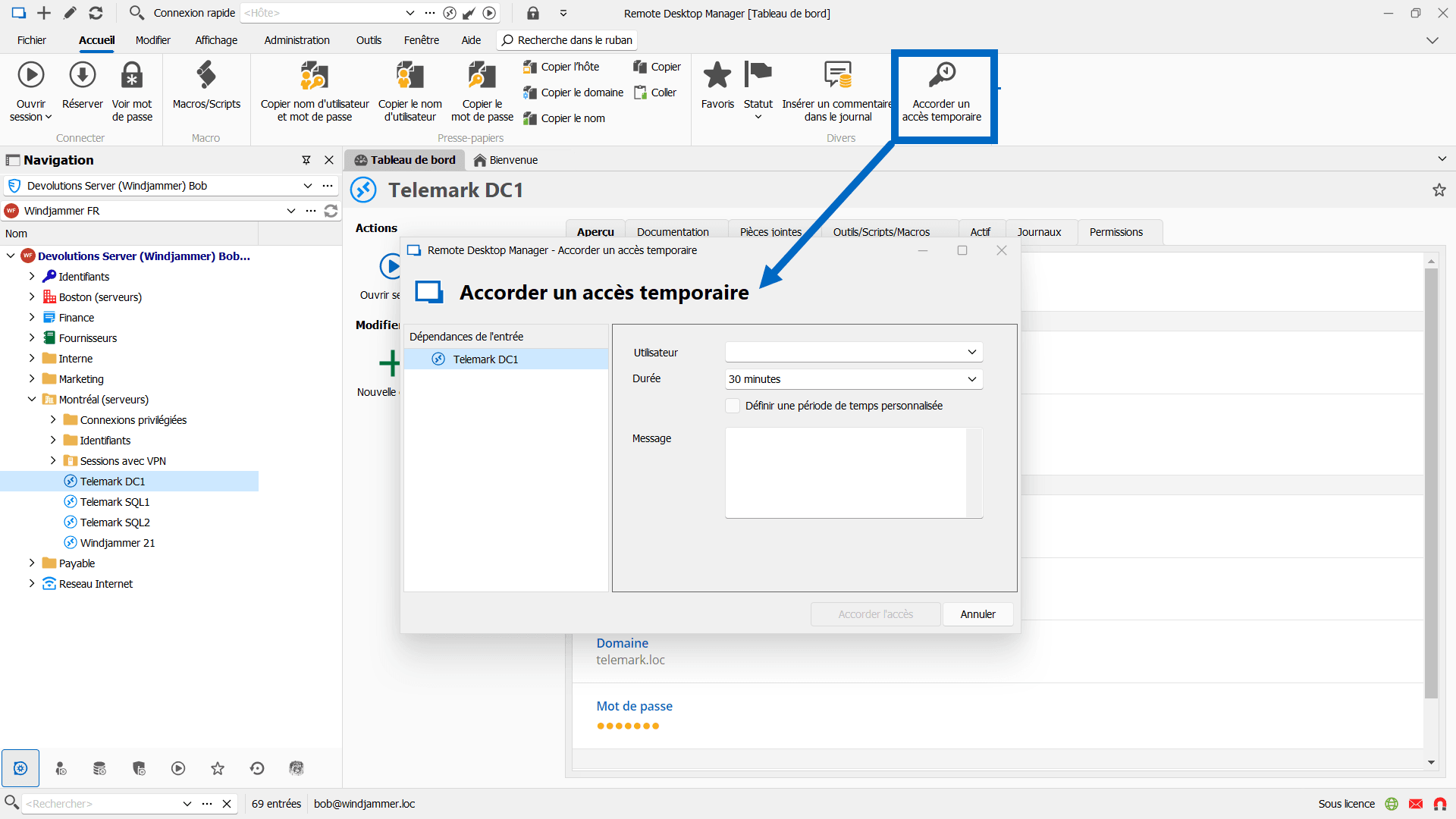 Les administrateurs peuvent maintenant accorder un accès temporaire pour une durée déterminée, à une date et une heure de leur choix. Sur le plan opérationnel, cette nouvelle option permet aux utilisateurs de spécifier s’ils ont besoin d’un accès temporaire spécial, soit en raison de sa durée ou du moment choisi. Ils peuvent même accompagner leur demande d’un message pour s’expliquer davantage. Sachez cependant qu’il est nécessaire d’activer le Mode d’accès temporaire dans les paramètres de sécurité des coffres pour profiter de cette fonctionnalité dans RDM et DVLS.