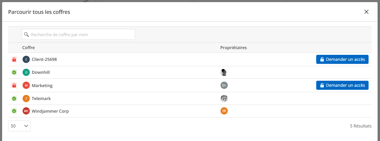 Grâce à cette nouvelle fonctionnalité, les utilisateurs peuvent effectuer une demande d’accès à un coffre en partage public visible sur leur liste (voir la note plus bas). Une fois la demande envoyée, les administrateur(s) ou les propriétaire(s) du coffre en question reçoivent une notification leur permettant d’accorder ou de refuser la demande.