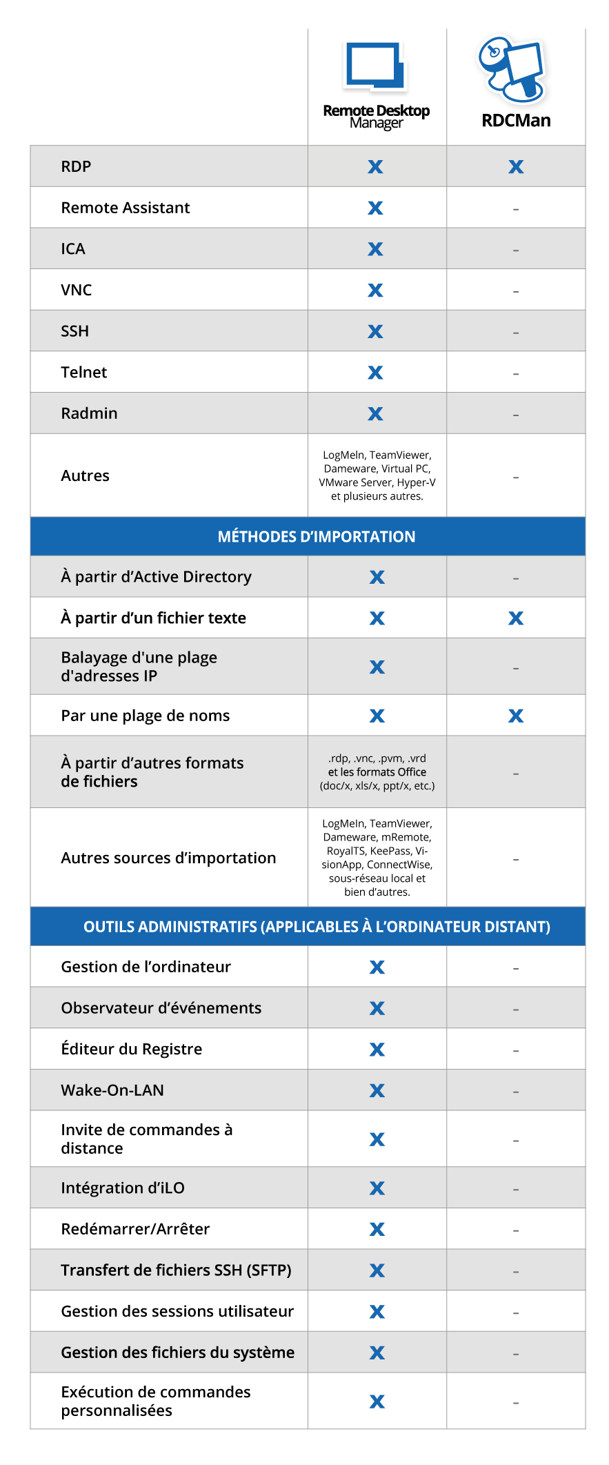 Le passage de RDCMan à Remote Desktop Manager (RDM) Enterprise constitue une mise à niveau importante. Voici un tableau utile pour vous aider à comparer les deux solutions.