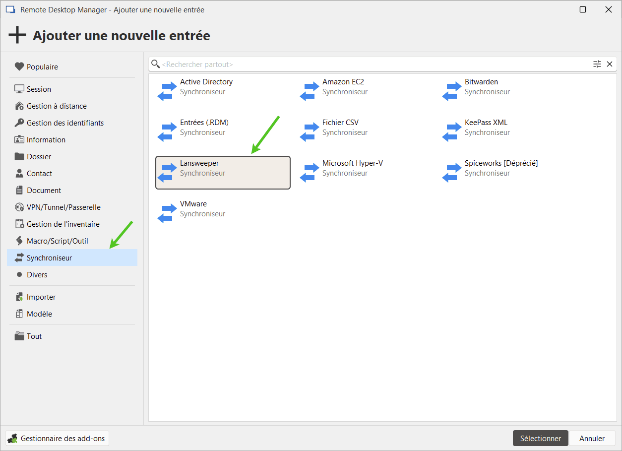 - Créer une entrée de synchroniseur Lansweeper : Ouvrez RDM et accédez à