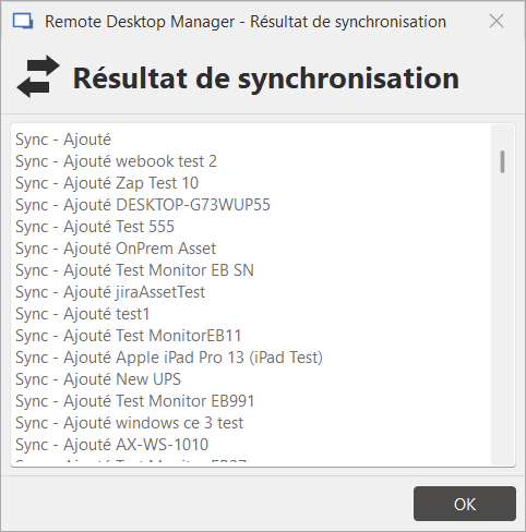 Une fois la configuration terminée, lancez le processus de synchronisation. Les nouvelles entrées créées à partir de Lansweeper apparaîtront alors dans RDM, prêtes à être utilisées.