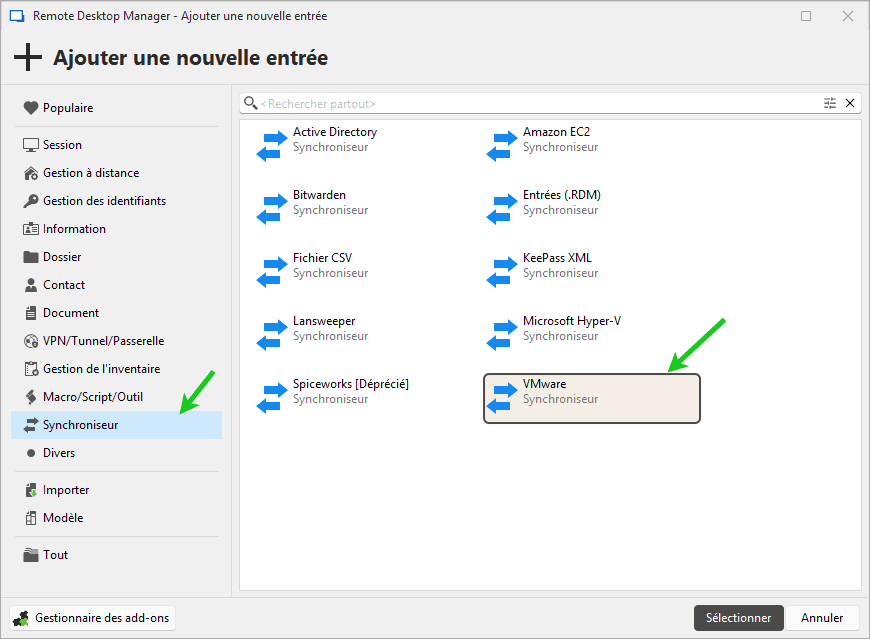 1 - Ajouter une nouvelle entrée de synchroniseur VMware: Dans RDM, allez dans Édition > Ajouter une nouvelle entrée > Synchroniseur, puis sélectionnez VMware pour créer une nouvelle entrée.