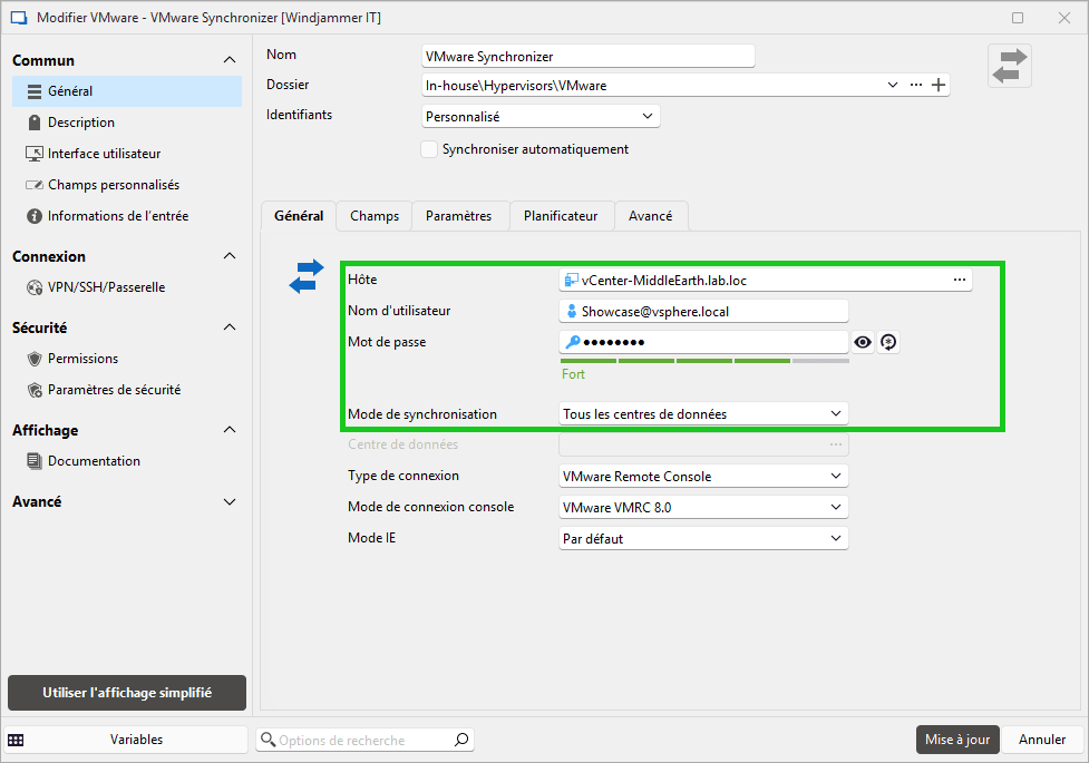 2 - Configurer la connexion vSphere : Renseignez le nom de l’hôte vSphere et les identifiants administratifs. Vous pouvez choisir de synchroniser l’ensemble des centres de données ou une sélection spécifique selon vos besoins.
