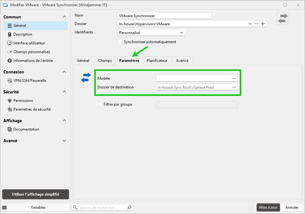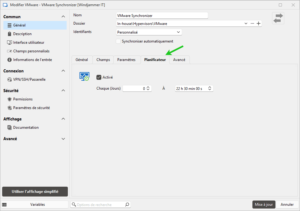 5 - Définir l’intervalle de synchronisation : Dans l’onglet Planification, définissez la fréquence de synchronisation (quotidienne à heure fixe, par exemple) pour que vos données RDM restent alignées avec vSphere. (Fonctionnalité requérant Devolutions Server.)