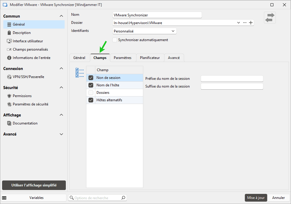 3 - Sélectionner les champs à synchroniser : Dans l’onglet Champs, définissez les attributs vSphere à inclure (ex. : nom de session, hôtes alternatifs) dans les sessions créées dans RDM.