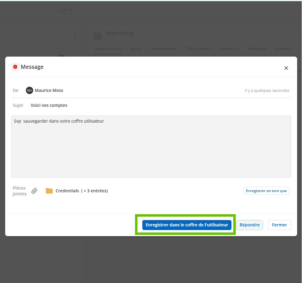 Cette fonctionnalité est particulièrement utile dans des scénarios tels que l’intégration de nouveaux utilisateurs, en s’assurant qu’ils reçoivent rapidement les comptes et les identifiants dont ils ont besoin pour commencer à travailler. Les messages à haute priorité seront visibles dès que les utilisateurs se connecteront à leur Hub. Pour faciliter davantage le processus d’intégration, un bouton désigné, Enregistrer dans le coffre de l’utilisateur, permet aux utilisateurs d’agir facilement.