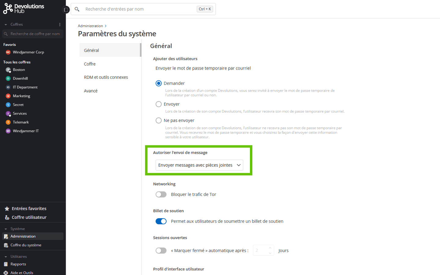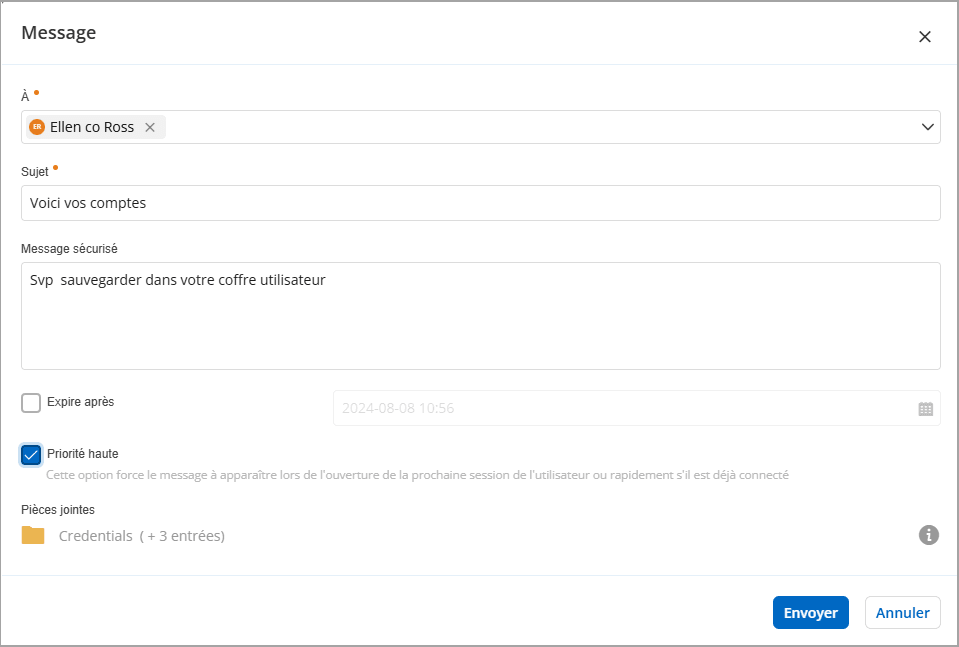 L’envoi de messages intégrés à l’application à d’autres utilisateurs de Hub a été une fonctionnalité clé pour de nombreux cas d’utilisation depuis le début de Devolutions Hub. À mesure que Hub a évolué, ses capacités de messagerie se sont également améliorées. Vous pouvez désormais marquer les messages comme étant de haute priorité, garantissant ainsi qu’ils reçoivent une attention immédiate. Les messages à haute priorité s’ouvriront directement dans l’interface web lorsque le destinataire accédera à Hub. Pour marquer un message comme étant de haute priorité, il suffit de cocher la case Priorité haute avant d’envoyer le message. Ce nouveau marquage est également applicable à l’envoi d’une copie d’un dossier ou d’une entrée, ce qui est un processus similaire à l’envoi d’un message.