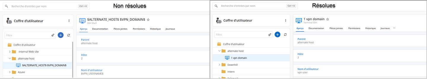 Nos utilisateurs de Remote Desktop Manager (RDM) travaillent souvent avec des variables, qui sont utiles pour stocker des entrées, manipuler des données et maintenir l’état. Désormais, lors de l’accès à Devolutions Hub via l’interface web, ces variables sont résolues automatiquement dans les champs