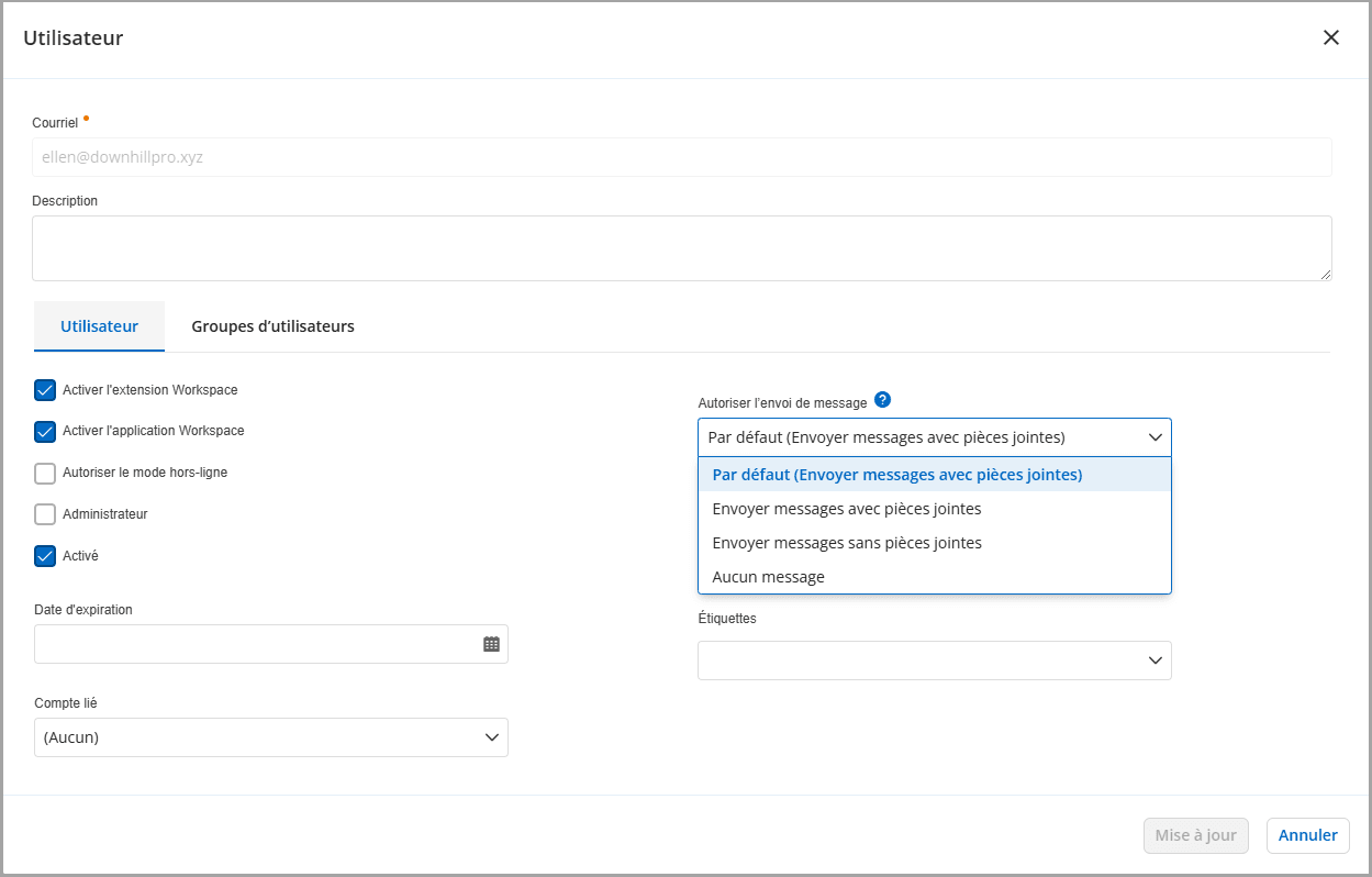 Précédemment, la possibilité de permettre aux utilisateurs d’envoyer des messages avec des entrées, sans entrées ou de ne pas envoyer de messages du tout était configurable uniquement par utilisateur. Ce paramètre fait désormais partie des paramètres système. Le paramètre par défaut du système est défini sur Envoyer des messages avec pièces jointes pour tous les nouveaux utilisateurs, et peut être modifié.