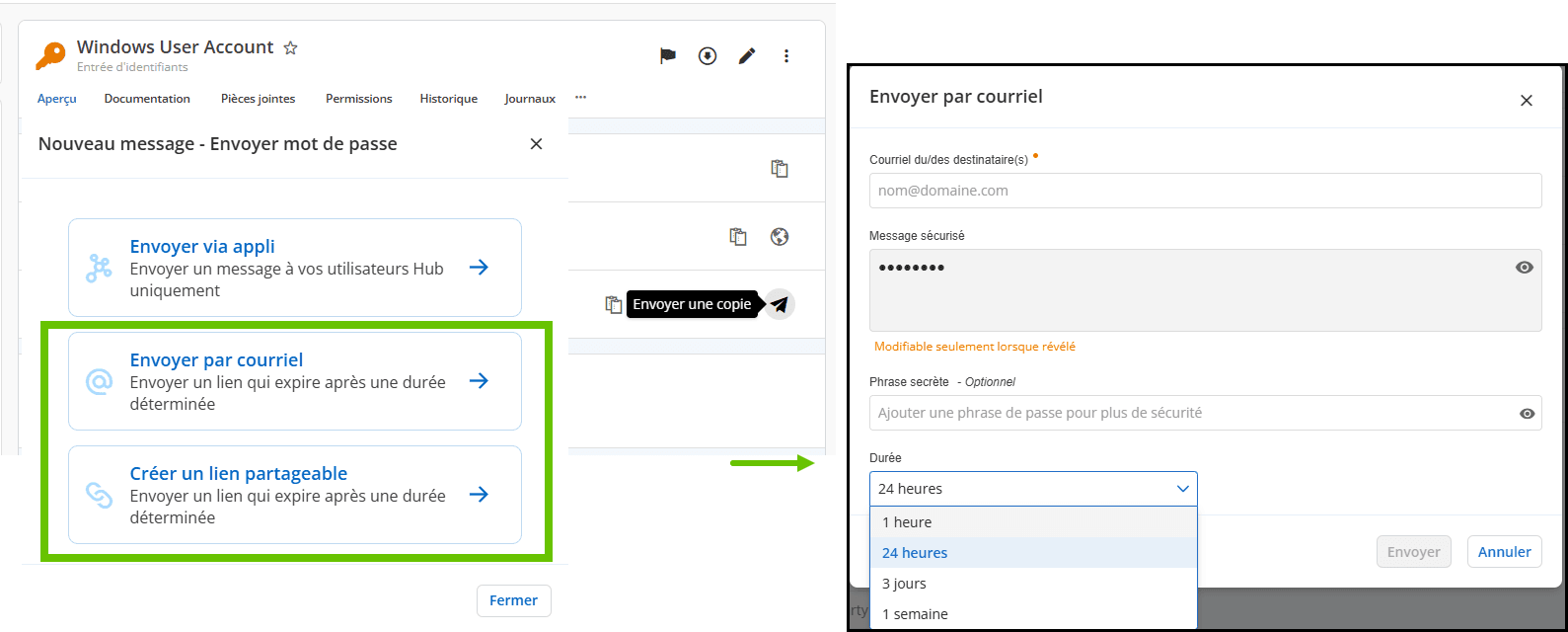 À la suite de la récente mise à jour de notre service Devolutions Send, qui a introduit des durées personnalisables pour les messages avec liens chiffrés, nous avons étendu cette fonctionnalité à Hub. Vous pouvez désormais sélectionner la durée des liens sécurisés envoyés via Hub, vous offrant ainsi un meilleur contrôle sur la sécurité de vos communications.