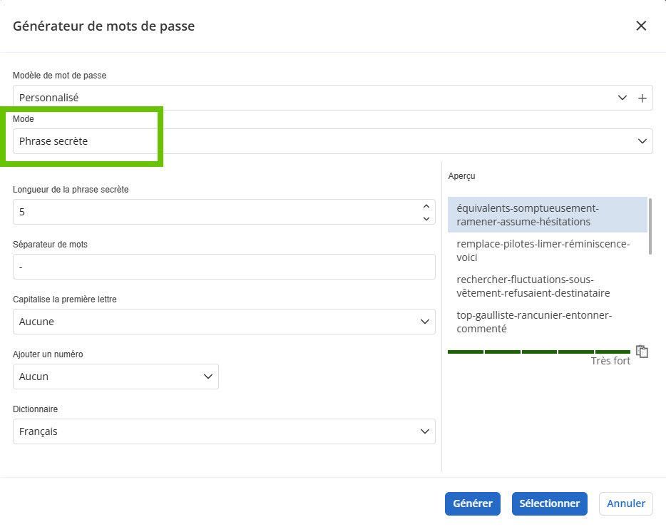 Vous pouvez accéder au générateur de mots de passe depuis le champ de mot de passe ou en définissant un modèle de mot de passe. Il suffit de sélectionner le mode Phrase secrète et d’ajuster les paramètres selon vos besoins de sécurité. Nous proposons actuellement des phrases en anglais ou en français.