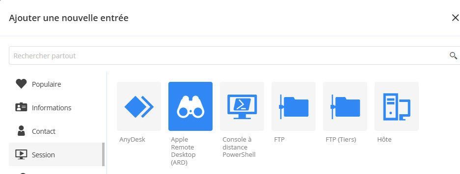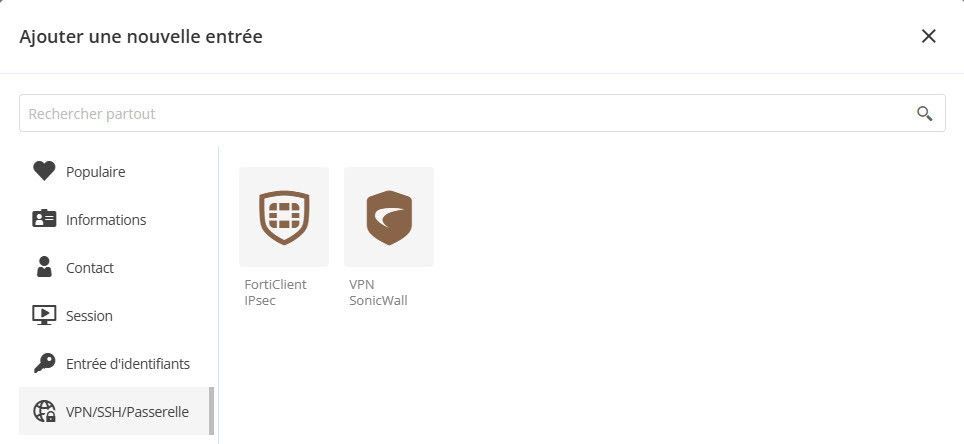 Vous pouvez désormais ajouter et gérer des entrées VPN FortiClient et SonicWall, ainsi que des sessions ARD, directement depuis l’interface web de Hub. Ces entrées, auparavant gérées uniquement via Remote Desktop Manager, offrent désormais aux utilisateurs de Hub une plus grande flexibilité et commodité. En particulier, les sessions ARD peuvent être ouvertes de manière fluide au sein d‘une session web dans Hub.