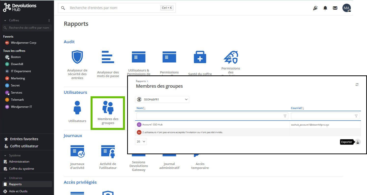 Vous cherchez une liste complète de vos membres de groupe avec une option d’exportation ? Rendez-vous dans Rapports > Membres des groupes. En sélectionnant le groupe, vous verrez tous les membres répertoriés. Si vous choisissez un groupe d’utilisateurs provenant de votre fournisseur d’identité, en plus de voir les membres ayant rejoint votre Hub, vous pourrez également voir combien de membres ne l’ont pas encore rejoint.