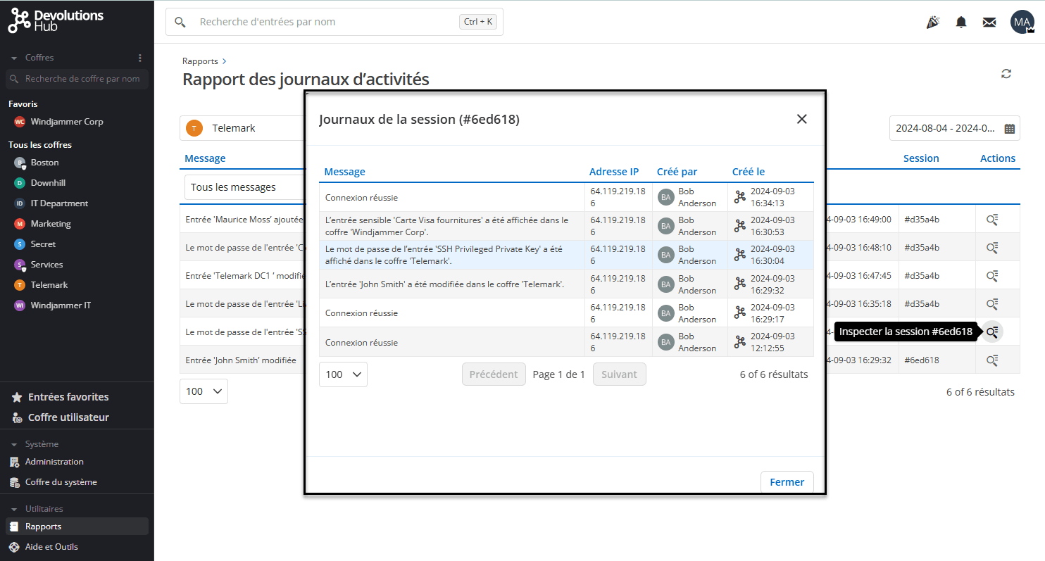 Les journaux d’activité incluent désormais un bouton Inspecter la session, qui affiche toutes les activités au sein d’une session de connexion utilisateur spécifique, désormais identifiée par un numéro de session. Ces améliorations permettent aux administrateurs et gestionnaires de surveiller les activités avec plus de précision lors de sessions utilisateur spécifiques, que ce soit via l’interface web, Workspace ou Remote Desktop Manager.