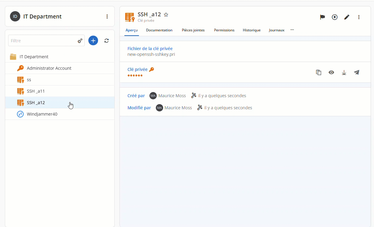 La gestion des clés SSH est désormais plus efficace grâce à la refonte de l’entrée des clés SSH. En plus d’importer une clé privée existante, vous pouvez désormais en générer une directement lors de l’ajout de l’entrée dans l’interface web de Hub. Une fois l’entrée ajoutée, toutes les actions nécessaires sont accessibles dans les propriétés de l’entrée : générer une clé publique ou même télécharger les clés dans le format de votre choix !
