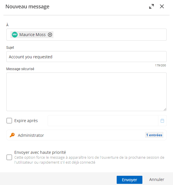 En cas d’urgence informatique, il est crucial que les messages importants soient vus sans délai. En marquant un message comme étant de haute priorité, celui-ci sera affiché immédiatement aux destinataires lorsqu’ils se connecteront à Devolutions Server, ou dans les secondes qui suivent s’ils sont déjà connectés.