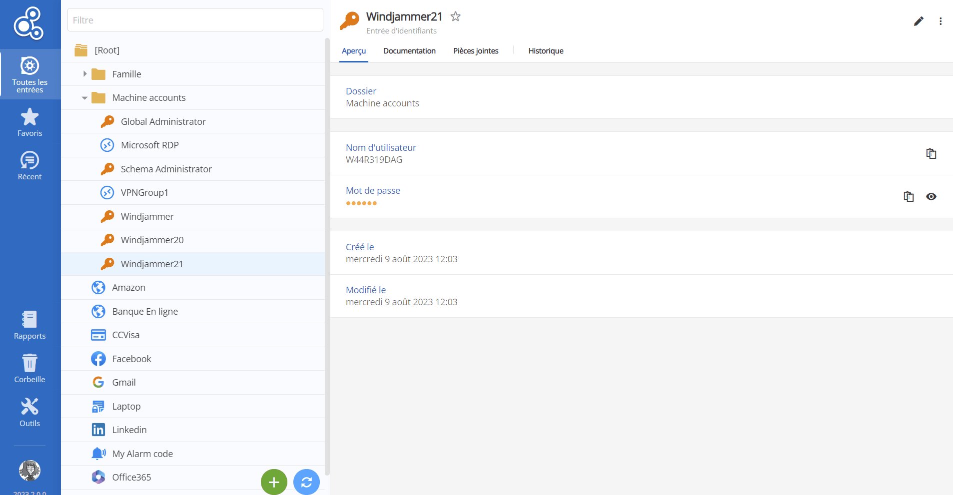 Devolutions Hub Personal est un gestionnaire de mots de passe gratuit, sécurisé et facile à utiliser conçu pour les utilisateurs individuels qui souhaitent stocker leurs mots de passe personnels dans un coffre protégé. Il convient parfaitement pour le stockage d’autres informations sensibles, comme les numéros de cartes de crédit ou les codes de systèmes d’alarme privés. D’ailleurs, il est beaucoup plus sûr d’utiliser Devolutions Hub Personal que de stocker ses données sensibles dans des tableurs comme Excel, des documents ou d’autres sources vulnérables.