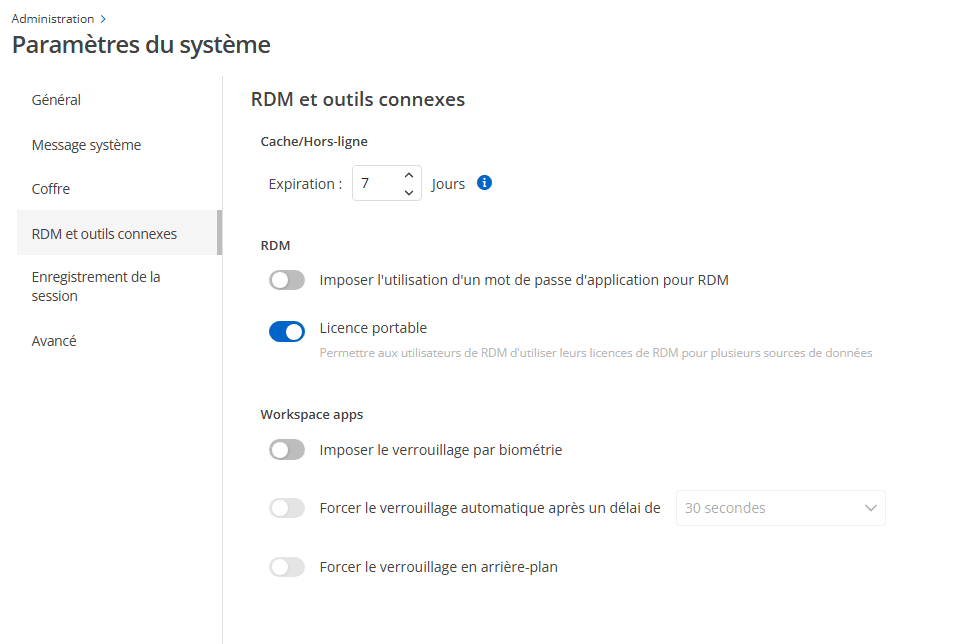 Dans Administration > Paramètres système > RDM et outils compagnons, vous pouvez configurer la disponibilité des licences portables.
