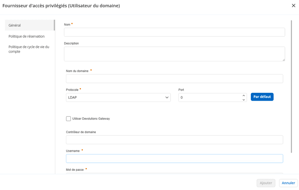 Vous pouvez désormais utiliser le fournisseur PAM Hub avec Active Directory local, comme illustré ci-dessus. Cette fonctionnalité repose sur Devolutions Hub Services, qui permet au Hub basé dans le cloud de se connecter à votre environnement local. Grâce à cette amélioration, vous pouvez gérer vos comptes AD locaux directement depuis le Hub. De plus, l’élévation juste-à-temps est également disponible pour les utilisateurs AD.