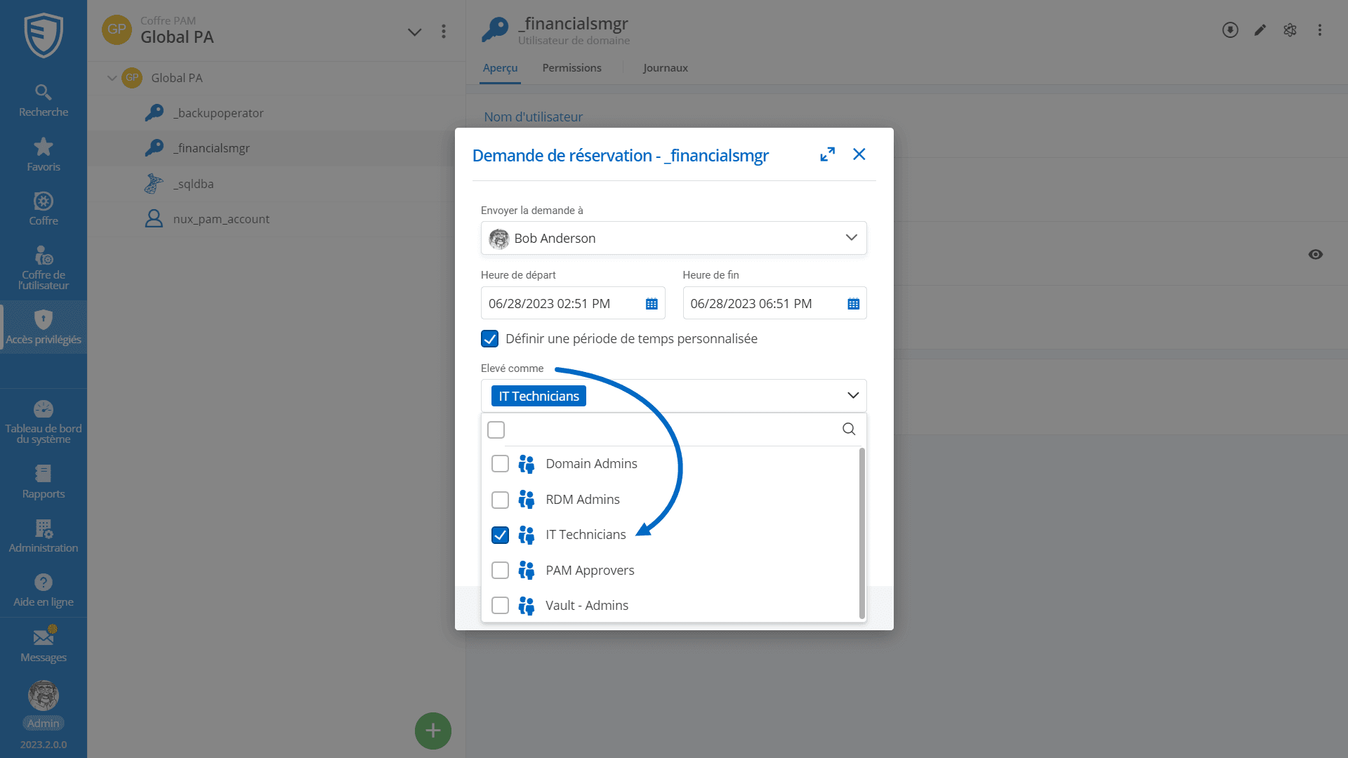 Nous avons ajouté une fonctionnalité permettant aux administrateurs d’accorder des accès temporaires proactivement ou à pour une date de leur choix. Cette nouvelle option est très pratique, car les utilisateurs doivent parfois effectuer des tâches lorsque les administrateurs ne sont pas disponibles pour leur accorder l’accès.