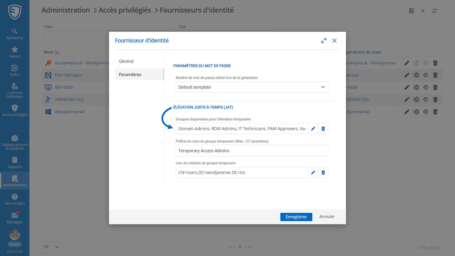 Cette nouvelle fonctionnalité permet aux utilisateurs d’effectuer des demandes d’autorisation élevées pour des comptes privilégiés. Les comptes disponibles doivent être configurés préalablement dans les paramètres du fournisseur PAM, où les comptes AD sont choisis pour l’élévation. Ces groupes temporaires sont générés ponctuellement et disposent d’une durée de vie limitée. Au moment de la restitution, le groupe est supprimé et les autorisations normales de l’utilisateur sont lui sont accordées de nouveau.
