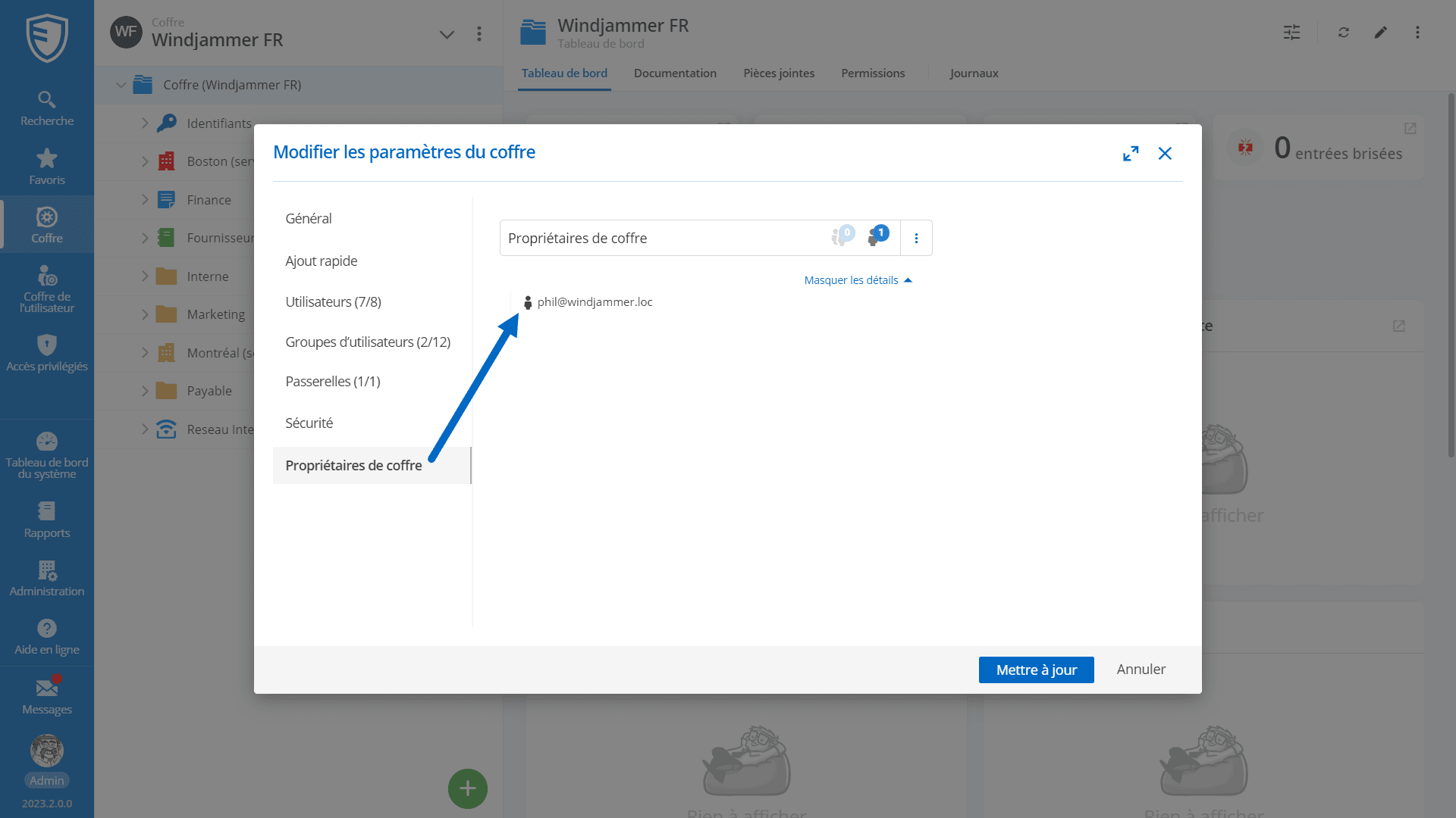 Chaque coffre peut être attribué à un propriétaire à partir de la section Gestion de coffres. Les propriétaires de coffre disposent de privilèges administratifs spéciaux à l’intérieur du coffre. Ils peuvent, entre autres, accorder et en refuser l’accès.