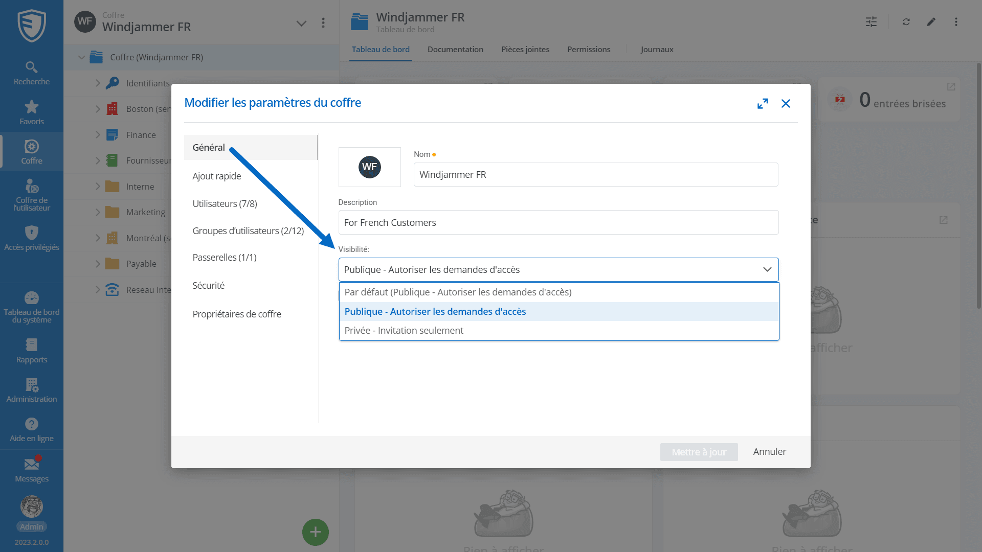 Les coffres sont en mode privés par défaut dans les paramètres système. Pour qu’ils s’affichent, le paramètre public doit être activé (soit dans tout le système ou dans chaque coffre). Soyez toutefois sans crainte : un coffre qui passe de privé à public n’accorde pas l’accès inconditionnel à tous ceux qui le consultent pour autant. Effectivement, et bien que le coffre en question s’affiche dans le menu déroulant de chaque utilisateur, ces derniers doivent demander une autorisation pour y accéder. Si un coffre ainsi modifié n’a pas été attribué à un propriétaire, alors un administrateur recevra la demande. Plus de détails sur les propriétaires dans quelques instants.