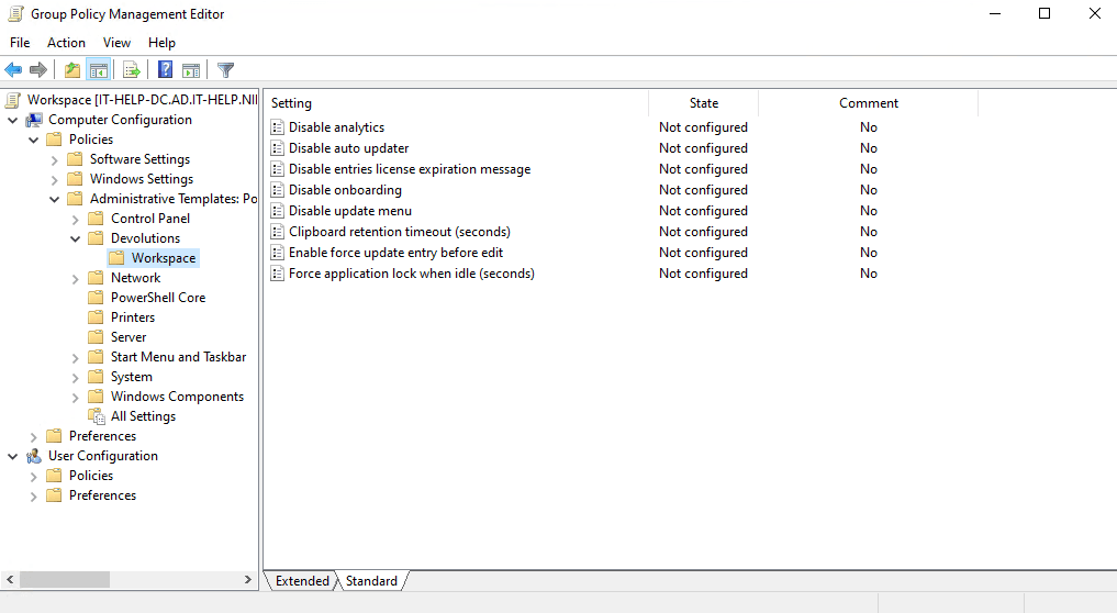Comme pour Remote Desktop Manager (RDM), Workspace propose désormais des paramètres configurables via GPO (Group Policy Object) dans un domaine Active Directory. Dans le répertoire d’installation de Workspace, localisez les fichiers Policies\Workspace.admx et Policies\Workspace.adml et placez-les respectivement dans les dossiers C:\Windows\PolicyDefinitions et C:\Windows\PolicyDefinitions\en-US de votre contrôleur de domaine.