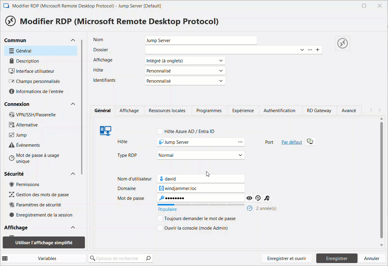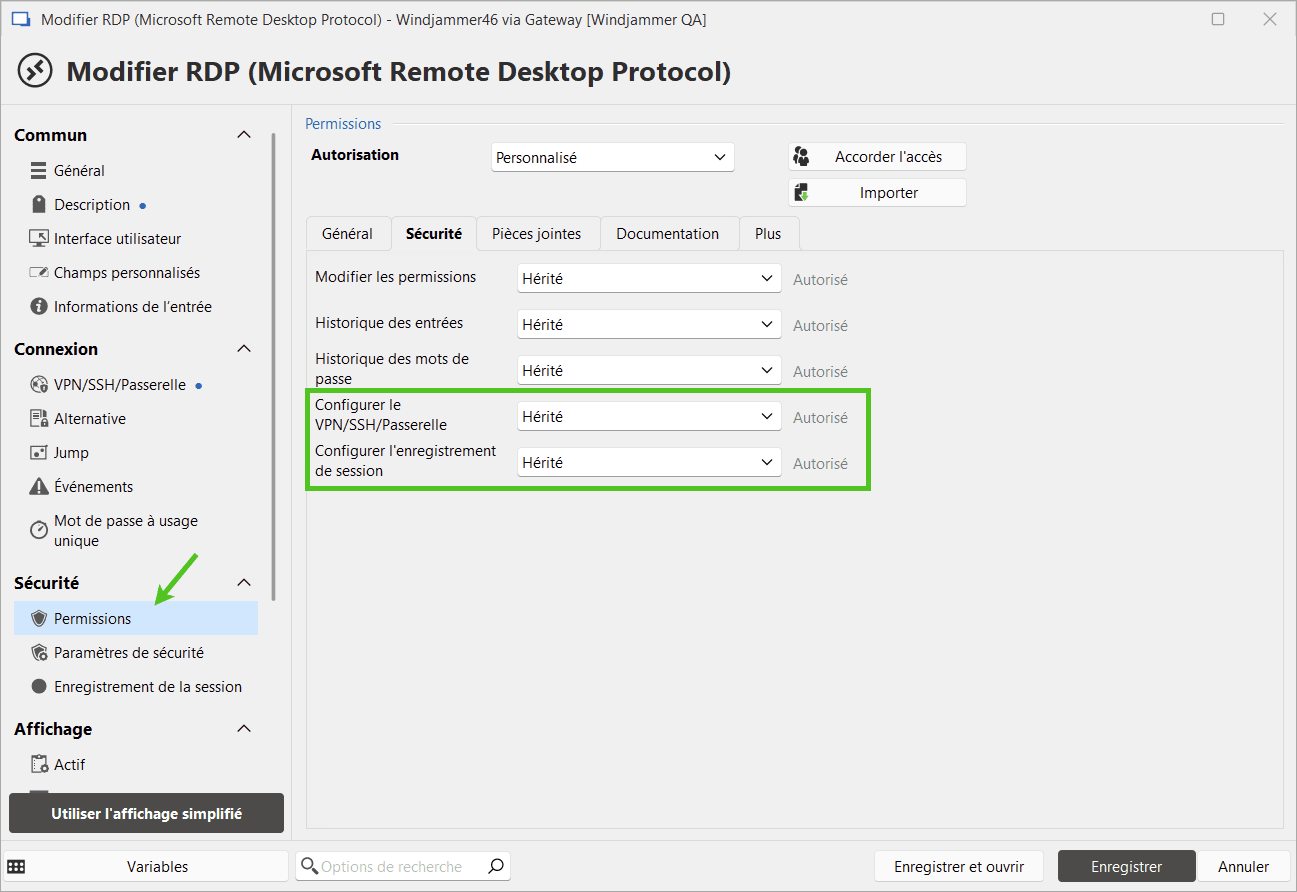 Les administrateurs peuvent désormais appliquer un contrôle plus strict en attribuant des permissions spécifiques pour la modification des sections VPN/Tunnel/Passerelle et enregistrement de session dans les entrées. Cela permet aux utilisateurs de conserver des droits d’édition généraux (si accordés) tout en empêchant les modifications des paramètres de connexion critiques.