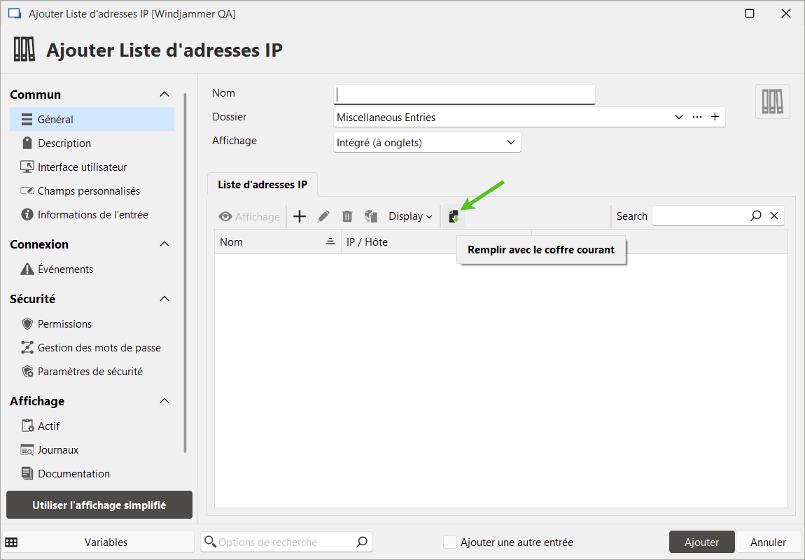 Liste d’adresses IP : Remplissage depuis le coffre actuel