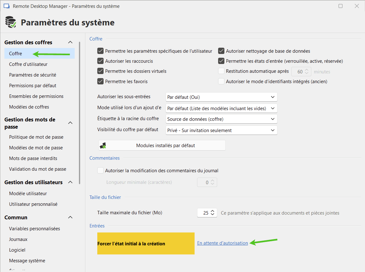 Un nouveau statut En attente d’autorisation a été ajouté aux entrées, permettant aux administrateurs de revoir et d’approuver les nouveaux éléments avant qu’ils ne soient pleinement utilisables. Tant qu’ils sont dans ce statut, seuls les propriétaires de coffre et les administrateurs peuvent exécuter l’entrée. Cette fonctionnalité est disponible pour tous les types d’entrées et peut être gérée directement dans Administration > Paramètres du système > Gestion des coffres via le paramètre Forcer l’état initial à la création. Vous pouvez ensuite consulter le statut sous l’onglet Description dans la fenêtre de propriétés de l’entrée.