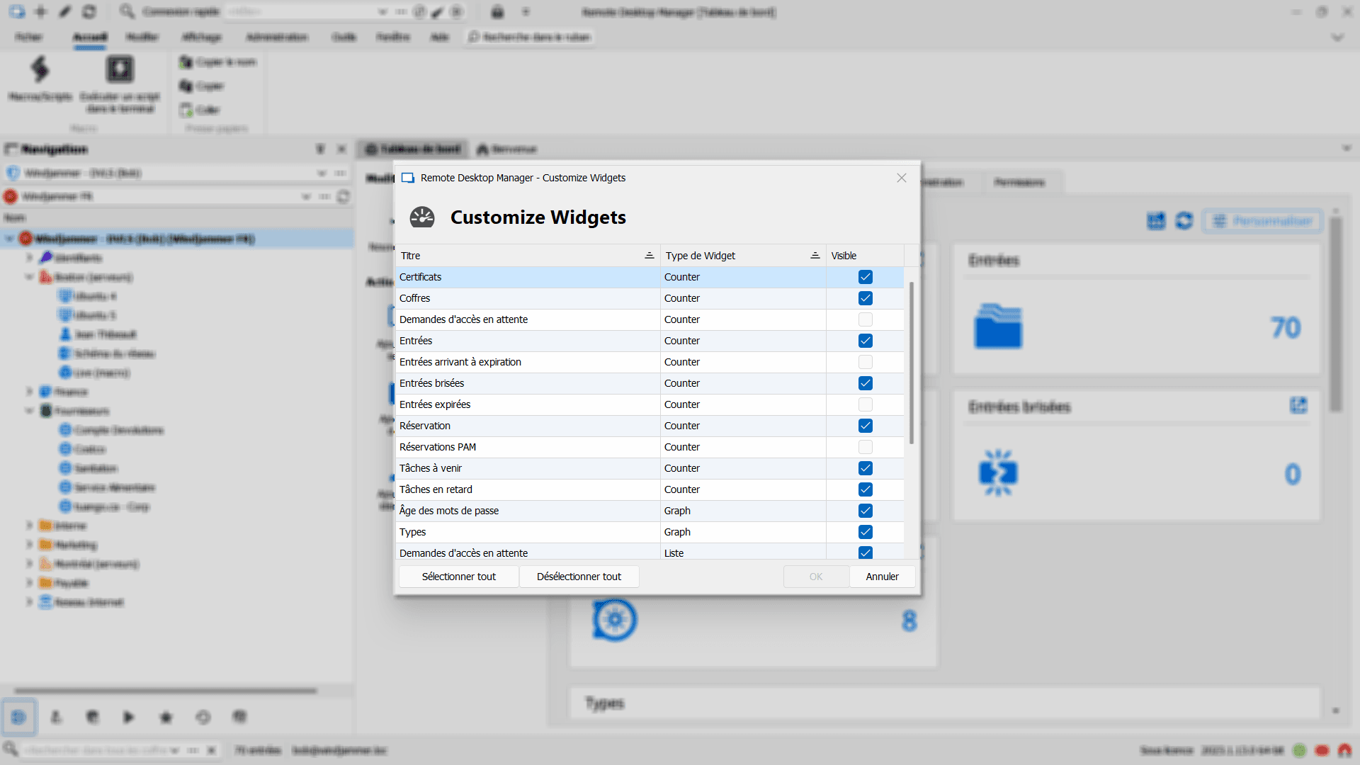 Nous avons ajouté des objets fenêtre personnalisables aux tableaux de bord, de sorte que l’on puisse y afficher les informations désirées. Il suffit d’effectuer un clic sur l’icône des objets fenêtre et de cocher ceux que l’on veut voir affichés à l’écran.
