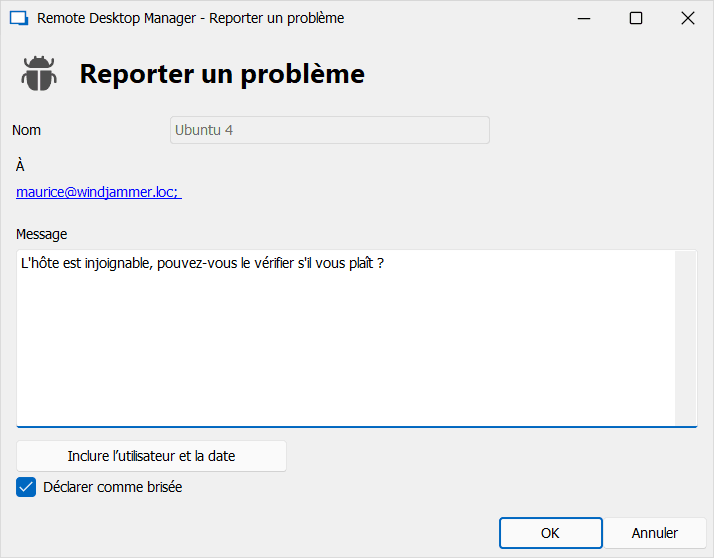 Des administrateurs nous ont dit qu’il devait forcément exister une méthode plus efficace et standard pour que les utilisateurs puissent signaler un lien brisé. Eh bien, comme on le dit souvent chez Devolutions : vos désirs sont des ordres!