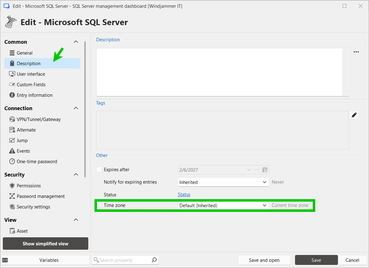 A new timezone setting has been added to the Description tab in connection properties. Users can select from three time display modes. This will allow users to see the current time in the target system's timezone directly in the Overview panel.