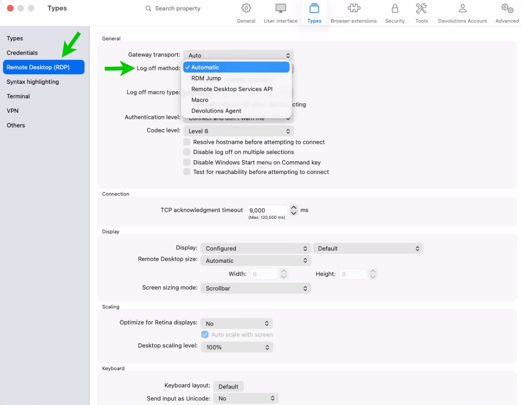 You can now choose the RDP logoff method under File → Settings → Types → RDP or per entry in the entry’s setting, improving compatibility across different Windows and RDS configurations. This helps ensure sessions end cleanly and consistently, reducing orphaned interactive sessions and aligning better with hardened or policy-driven environments.