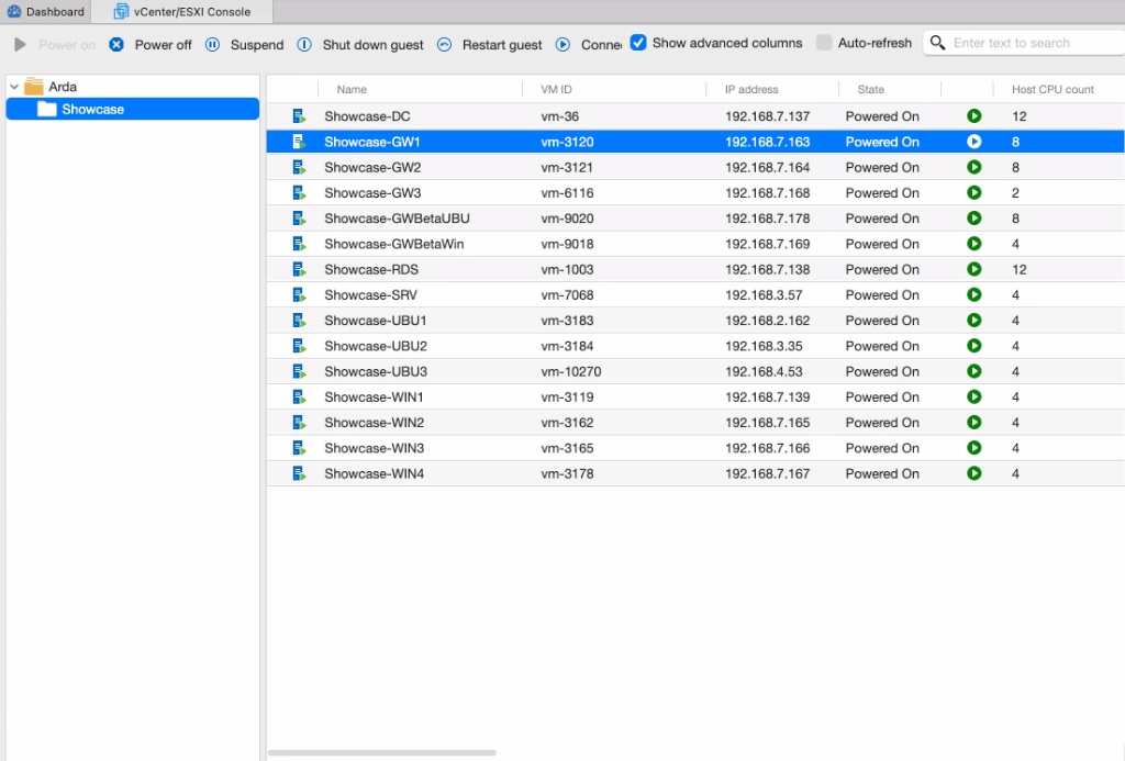 The dashboard now displays the vSphere folder structure, and you can view additional columns such as DNS hostname, Guest OS, and more for your listed VMs.